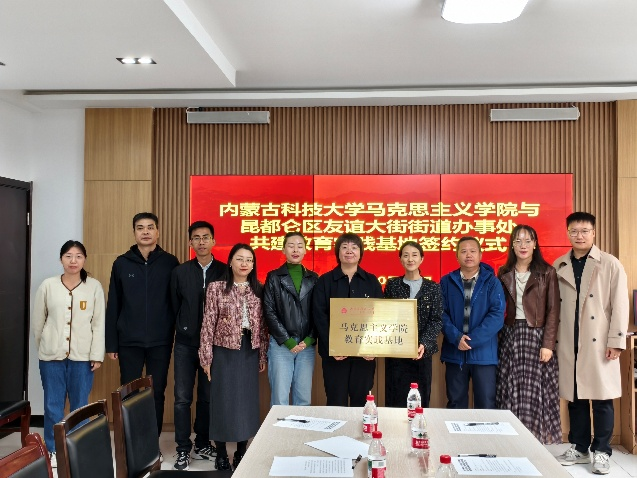 岳婧芳书记详细介绍了友谊大街街道所辖社区的基本情况,对马克思主义学院在社区建设教育实践基地表示热烈欢迎与支持,贾磊副书记对内蒙古科技大学的校情、马克思主义学院的院情、思想政治教育专业人才培养情况等做了系统深入的介绍。双方就未来在学生实习、党建合作、项目研究等方面的持续合作达成一致。